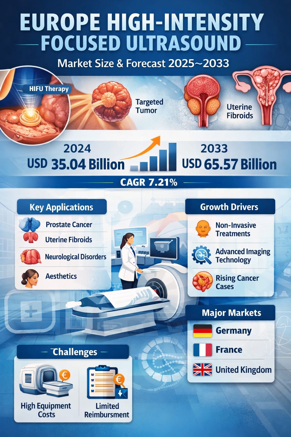 According to Renub Research, the Europe High-Intensity Focused Ultrasound Market was valued at USD 35.04 billion in 2024 and is expected to reach USD 65.57 billion by 2033, expanding at a compound annual growth rate (CAGR) of 7.21% from 2025 to 2033. This impressive growth trajectory reflects not only technological progress, but also a broader shift in how medicine is practiced across the region.