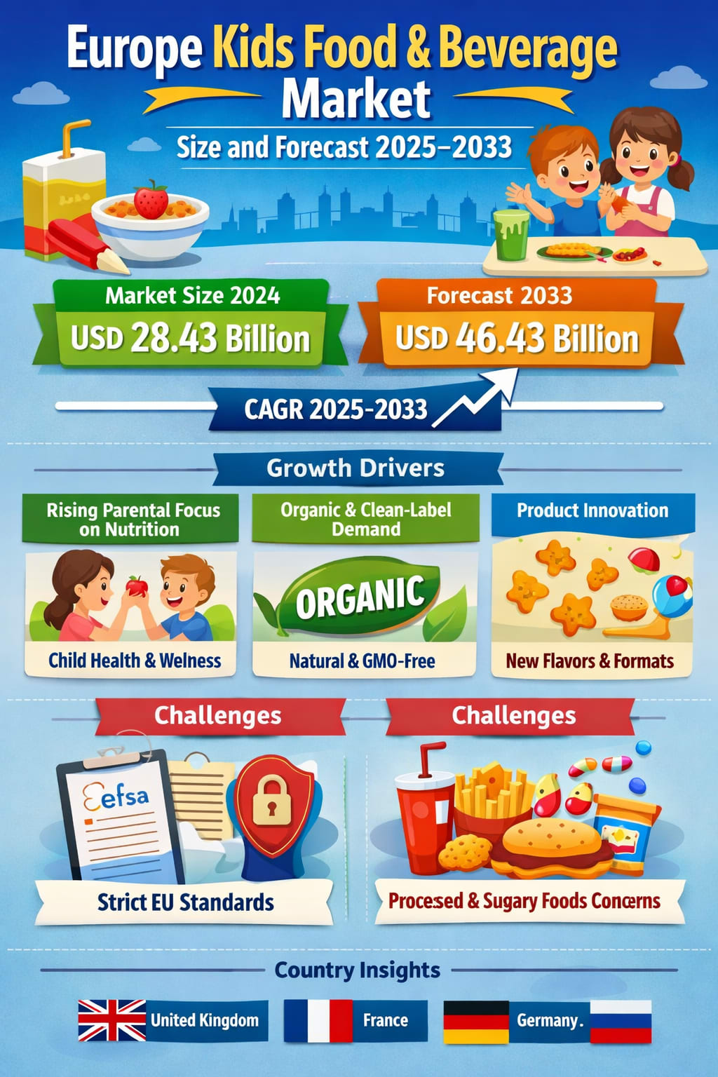 The Europe Kids Food & Beverage Market is on a strong and sustainable growth path, driven by a powerful combination of health-conscious parenting, regulatory support for better nutrition, and continuous product innovation. With the market expected to grow from USD 28.43 billion in 2024 to USD 46.43 billion by 2033, the sector offers significant opportunities for both established brands and innovative newcomers.