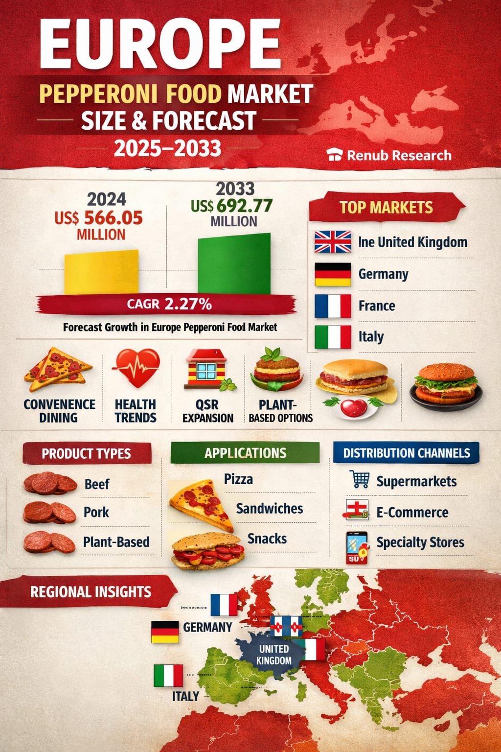 According to Renub Research, the Europe Pepperoni Food Market is expected to reach US$ 692.77 million by 2033, up from US$ 566.05 million in 2024, growing at a compound annual growth rate (CAGR) of 2.27% from 2025 to 2033. This steady expansion reflects broader shifts in European eating habits—most notably the rising demand for convenience foods, the influence of global fast-food culture, and ongoing innovation in healthier and alternative protein products.