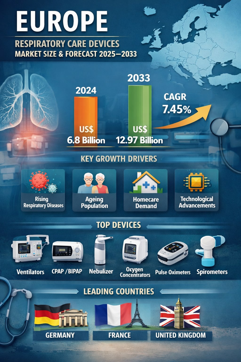 According to Renub Research, the Europe Respiratory Care Devices Market is expected to grow from US$ 6.8 billion in 2024 to US$ 12.97 billion by 2033, registering a compound annual growth rate (CAGR) of 7.45% during 2025–2033. This robust expansion reflects a convergence of powerful forces: rising respiratory disease prevalence, an aging population, increasing air pollution, rapid technological innovation, expanding homecare adoption, and heightened post-COVID-19 awareness about lung health.