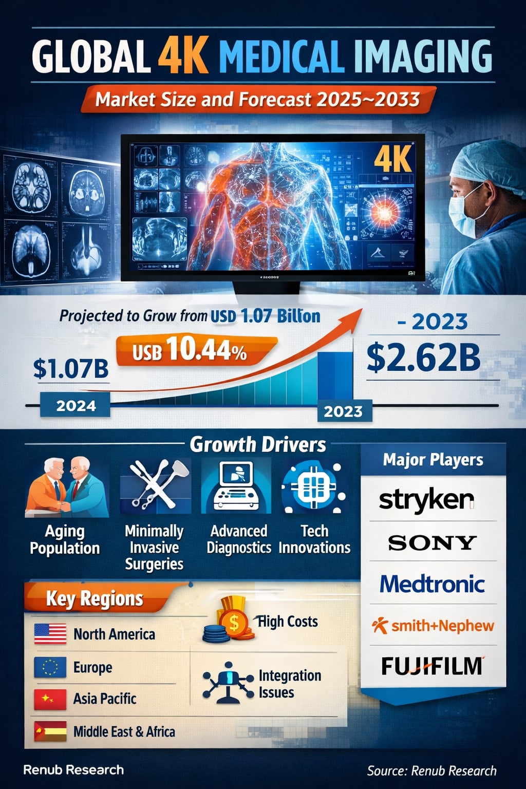 According to Renub Research, the global 4K medical imaging market is expected to reach US$ 2.62 billion by 2033, up from US$ 1.07 billion in 2024, registering a CAGR of 10.44% from 2025 to 2033. This robust growth reflects the healthcare sector’s increasing reliance on high-resolution visualization, rising healthcare expenditures, rapid technological progress, and the expanding use of minimally invasive surgical techniques worldwide.