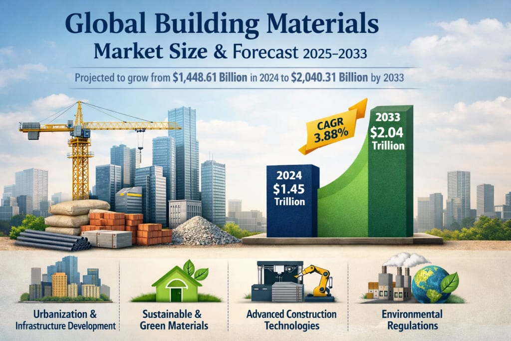 The global building materials market is entering a new era defined by sustainability, technology, and large-scale urban development. With the market expected to grow from US$ 1,448.61 billion in 2024 to US$ 2,040.31 billion by 2033 at a CAGR of 3.88%, opportunities abound for manufacturers, suppliers, and investors alike.