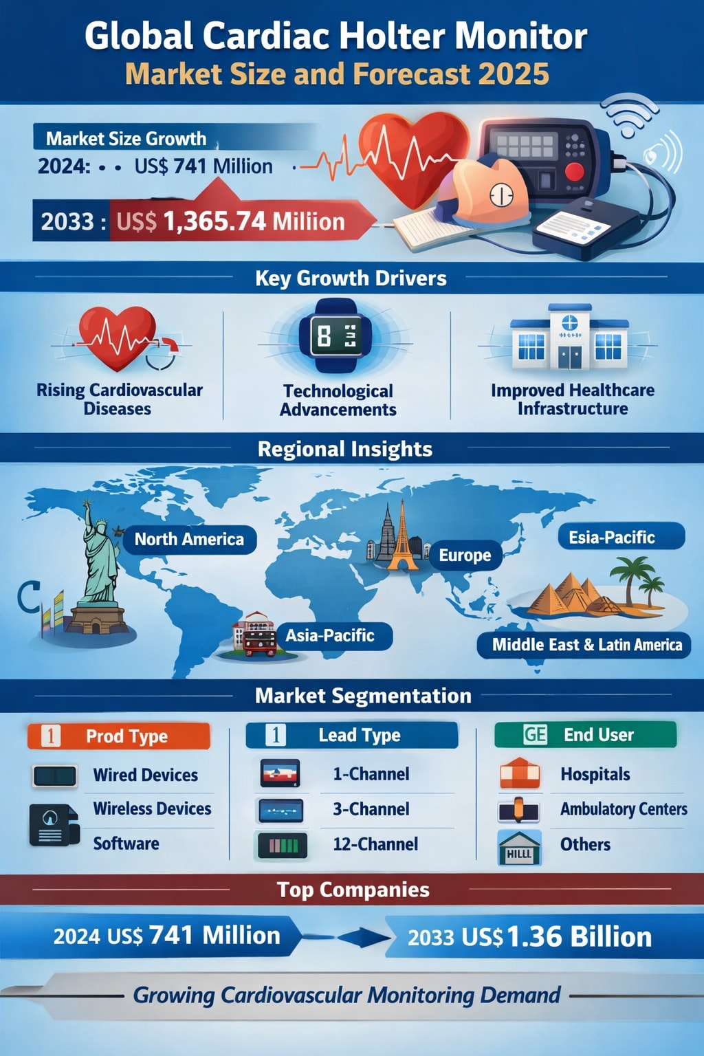The Global Cardiac Holter Monitor Market stands at a promising crossroads of medical necessity and technological innovation. With the market projected to grow from US$ 741.00 million in 2024 to US$ 1,365.74 million by 2033 at a CAGR of 7.03%, the future looks strong for this essential diagnostic segment.