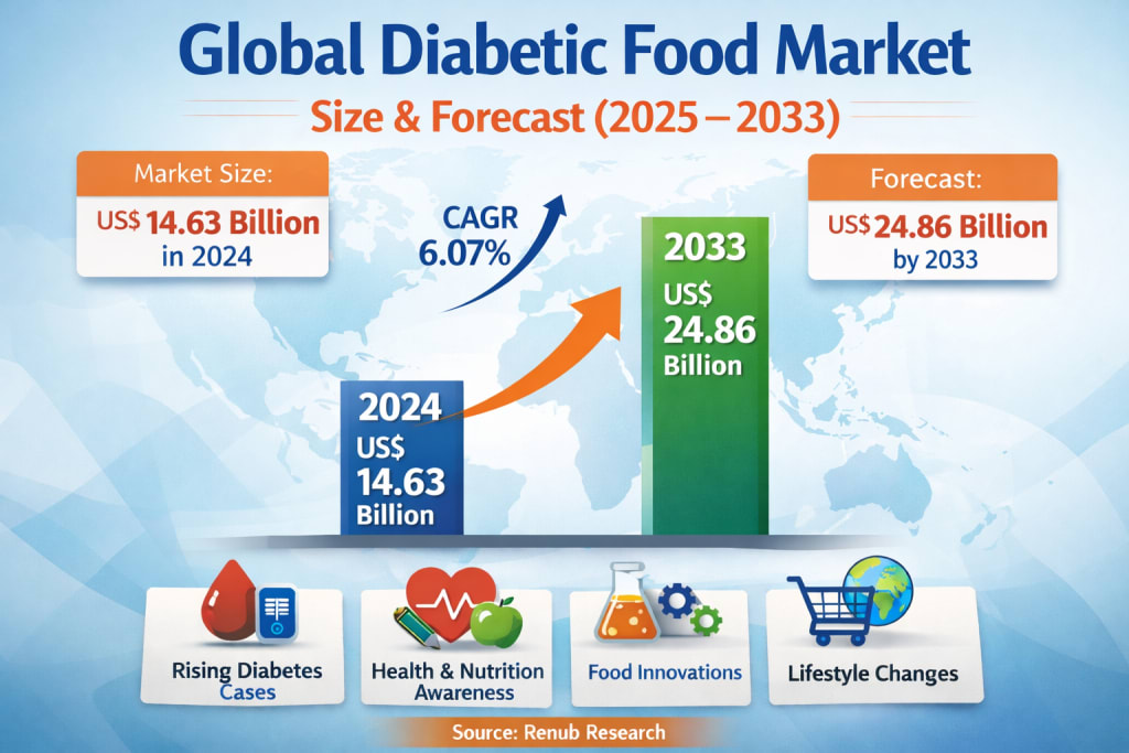 The global diabetic food market is entering a decisive decade, driven by the rising prevalence of diabetes, stronger awareness of nutrition, and rapid innovation in food technology. According to Renub Research, the Diabetic Food Market is expected to reach US$ 24.86 billion by 2033, up from US$ 14.63 billion in 2024, growing at a CAGR of 6.07% from 2025 to 2033. This steady growth reflects not only the expanding diabetic population worldwide, but also a broader shift in consumer behavior toward healthier, more functional, and more personalized food choices.