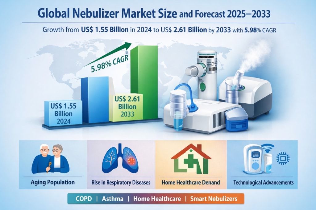 The Global Nebulizer Market is projected to reach US$ 2.61 billion by 2033, up from US$ 1.55 billion in 2024, expanding at a CAGR of 5.98% from 2025 to 2033. This steady growth reflects a powerful mix of demographic, clinical, and technological trends shaping modern respiratory care.