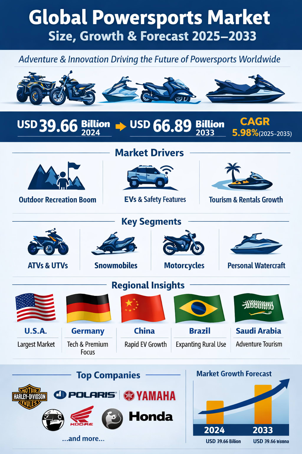 The global powersports market is entering a dynamic new phase. With the market expected to grow from USD 39.66 billion in 2024 to USD 66.89 billion by 2033, the industry is clearly benefiting from a powerful mix of lifestyle shifts, technological progress, and expanding recreational and utility use cases.