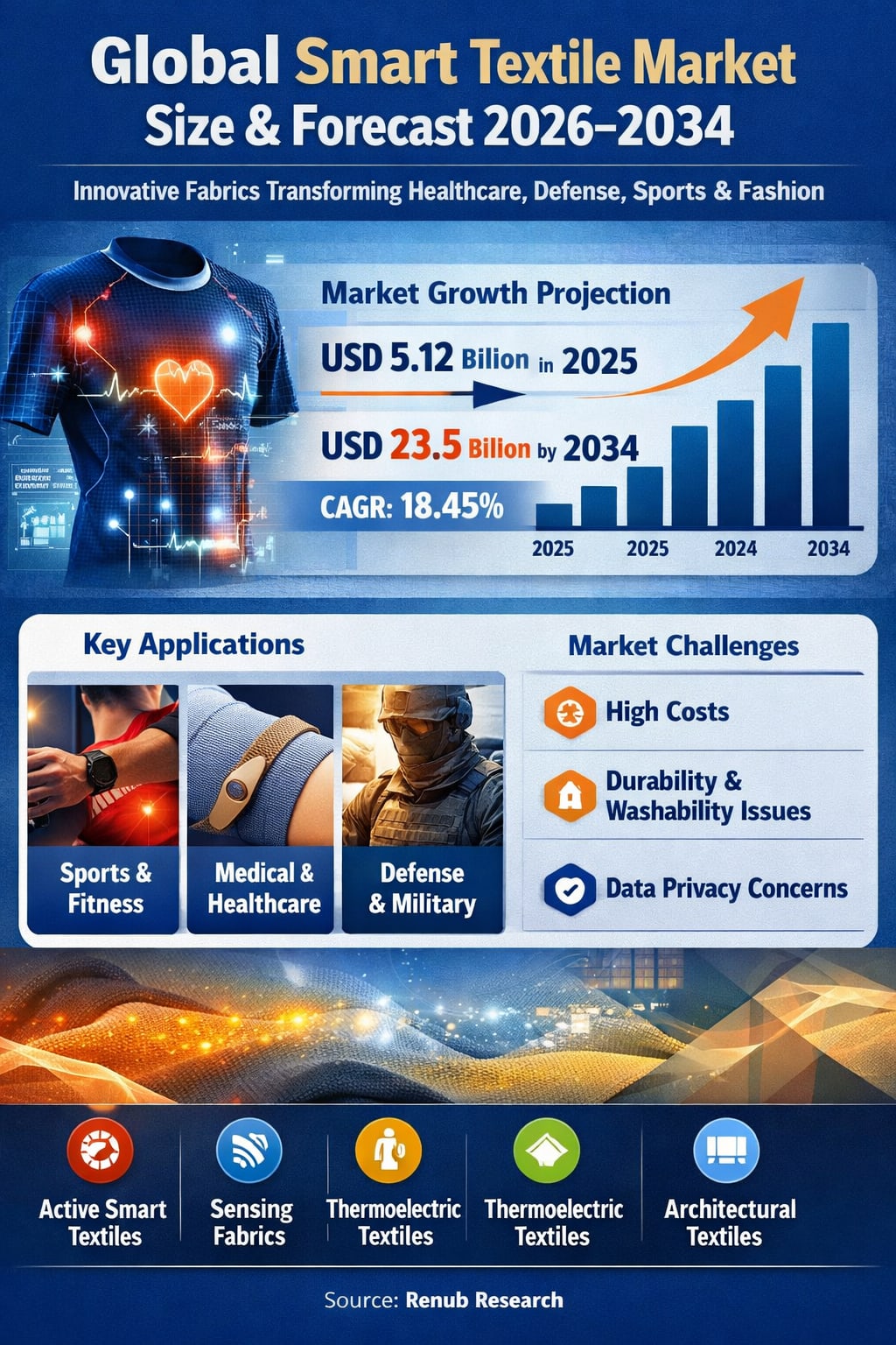 According to Renub Research, the Global Smart Textiles Market is projected to expand dramatically from USD 5.12 billion in 2025 to USD 23.5 billion by 2034, registering a robust CAGR of 18.45% during the forecast period 2026–2034. This rapid growth reflects a broader technological shift where fabrics are no longer passive materials but active participants in health monitoring, performance optimization, safety enhancement, and interactive design.