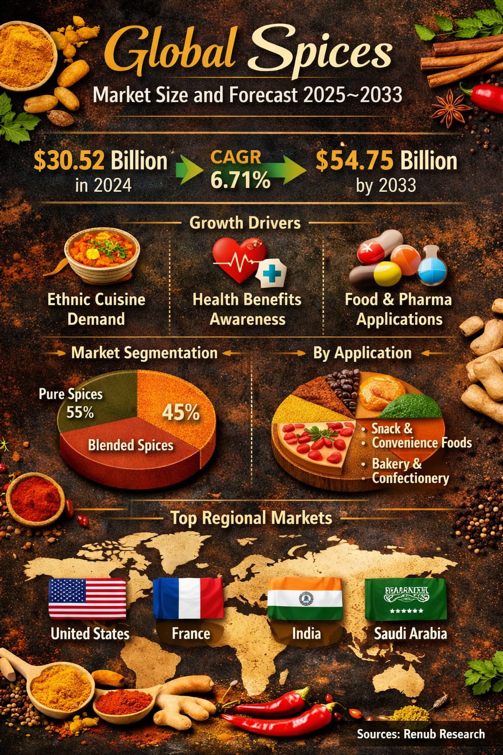 The global spices market is entering a phase of sustained and dynamic growth, supported by changing food habits, rising health awareness, and the globalization of cuisine. According to Renub Research, the Global Spices Market was valued at US$ 30.52 billion in 2024 and is projected to expand at a CAGR of 6.71% during 2025–2033, reaching an estimated US$ 54.75 billion by 2033.