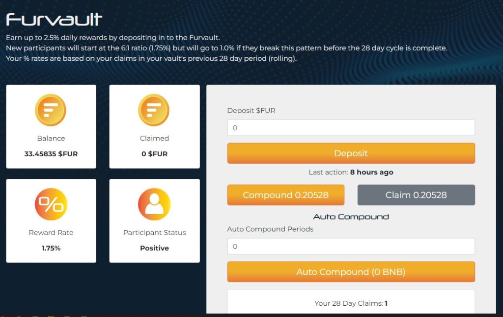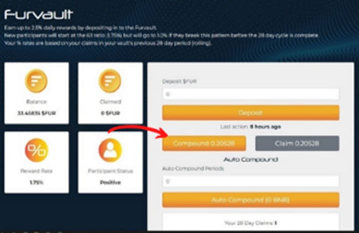 This is an important mechanism about the protocol you must understand before committing funds. Your principal amount (initial token deposit plus any added deposits including compounds), are locked up in the smart contract and cannot be withdrawn in one lump sum. Only your daily reward is available to you each day to either claim(withdraw) or compound. Each participant must carefully consider their personal strategy of how often to compound and when to claim to achieve their own financial goals. The ultimate objective is to compound until you have reached the maximum vault balance of 27,777.78 tokens which entitles you to claim 100,000 $FUR tokens at a daily rate determined by how many times per week you claim.