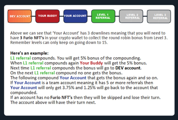 Someone uses your referral address and makes a deposit into the vault. That first deposit earns you the Initial Round Robin Bonus. This applies to your direct accounts (one level down). Any account that joins using your account address will qualify as a direct referral and you will receive 10% equivalent of their deposit direct into your vault, (after they pay the 10% deposit tax). So, if your direct referral deposits 100 $FUR tokens, they pay 10 tokens deposit tax, and 90 tokens go into their vault. Your initial round robin bonus is 10% of the 90 which is 9 tokens into your vault.