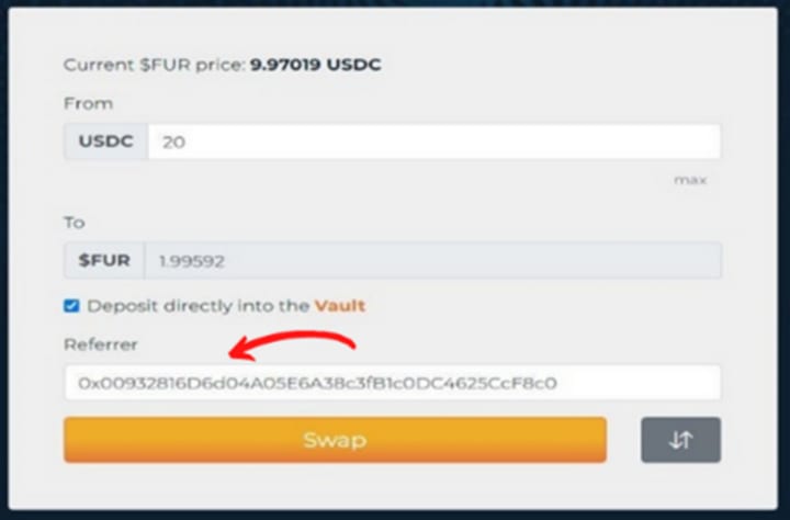 3. Once you have USDC, use the Furswap page to exchange USDC for $FUR and deposit into your vault here: https://app.furio.io/