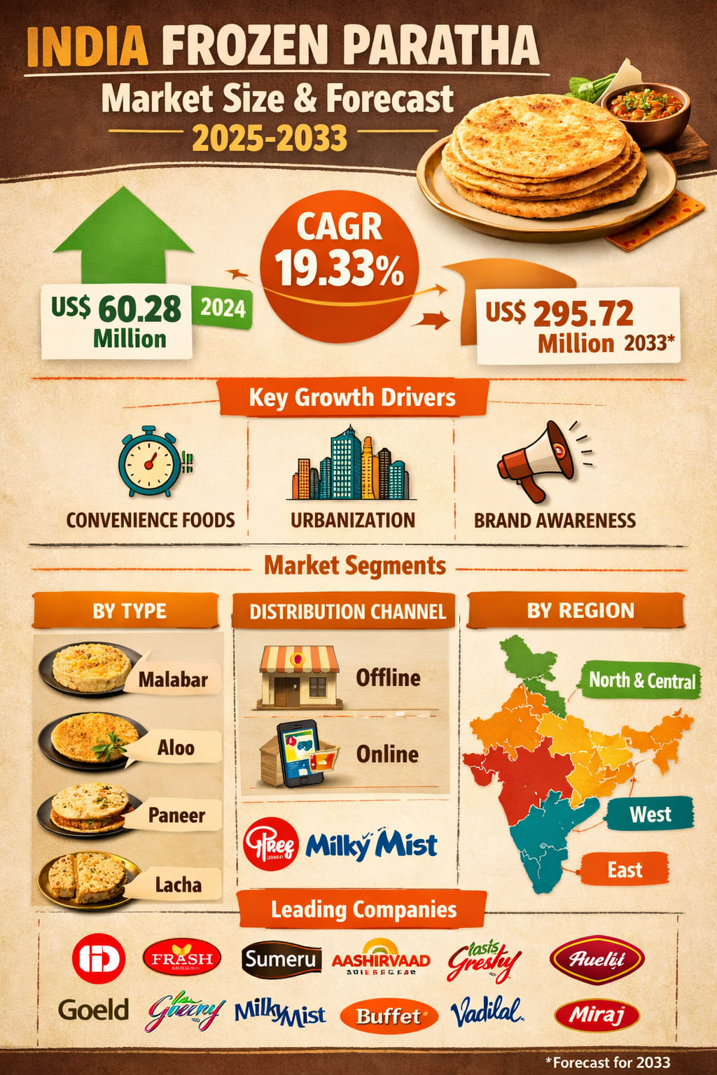 Driven by urbanization, rising incomes, changing lifestyles, and improving retail and cold chain infrastructure, frozen parathas are well-positioned to become a regular feature in Indian kitchens. While challenges such as cold chain limitations and competition from fresh alternatives remain, continuous innovation, strong branding, and expanding distribution networks are likely to overcome these hurdles over time.