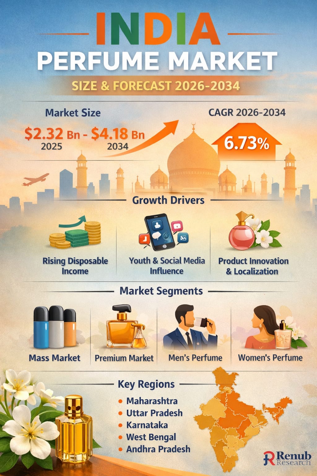 The India perfume market is undergoing a notable transformation, evolving from a niche luxury category into a mainstream personal grooming essential. According to Renub Research, the market is projected to grow from US$ 2.32 billion in 2025 to US$ 4.18 billion by 2034, registering a compound annual growth rate (CAGR) of 6.73% during 2026–2034.