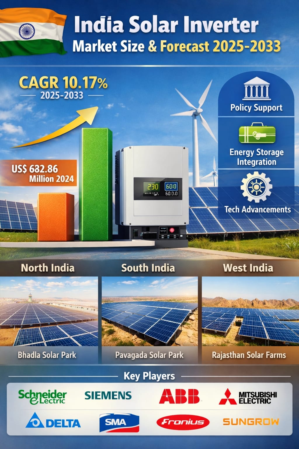 According to Renub Research-style market estimates, the India Solar Inverter Market is expected to reach US$ 1,632.69 million by 2033, up from US$ 682.86 million in 2024, registering a compound annual growth rate (CAGR) of 10.17% from 2025 to 2033. This growth is being driven by multiple forces, including the rapid expansion of solar capacity, rising adoption of energy storage systems, supportive government policies, and continuous technological innovation in inverter design.