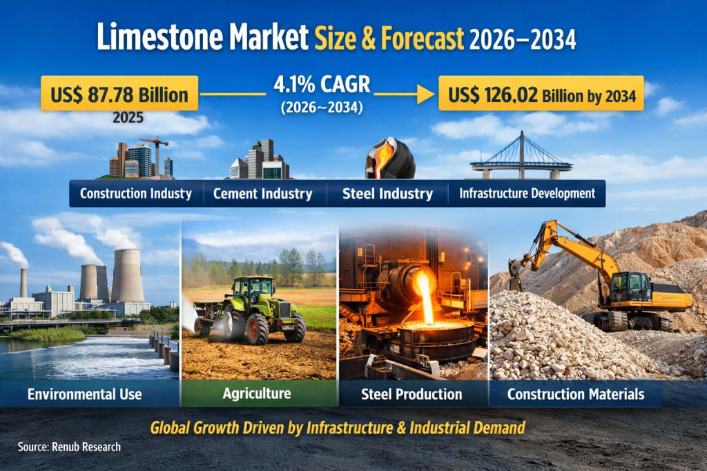 The global Limestone Market is projected to grow steadily over the coming decade, increasing from US$ 87.78 Billion in 2025 to US$ 126.02 Billion by 2034, expanding at a compound annual growth rate (CAGR) of 4.1% between 2026 and 2034. The market’s growth is largely driven by rising demand from key sectors such as construction, cement production, steel manufacturing, and large-scale infrastructure development.