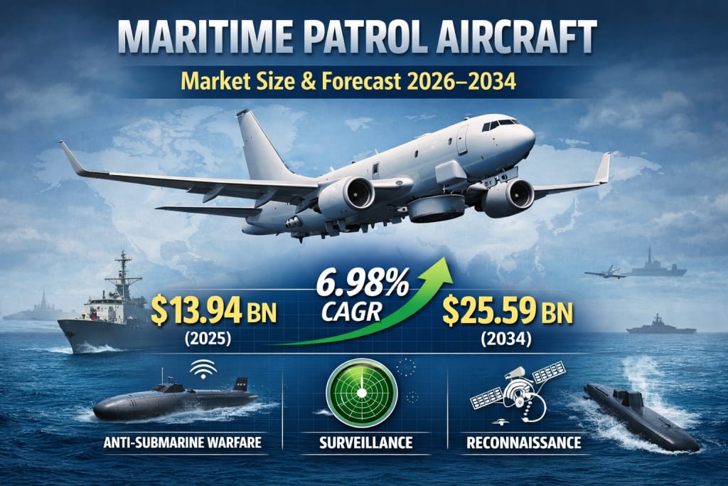 The Maritime Patrol Aircraft Market is entering a decisive growth phase, driven by rising security threats, accelerating naval modernization, and rapid technological progress. With Renub Research forecasting growth from USD 13.94 billion in 2025 to USD 25.59 billion by 2034 at a 6.98% CAGR, the sector reflects how critical maritime air power has become in today’s strategic landscape.