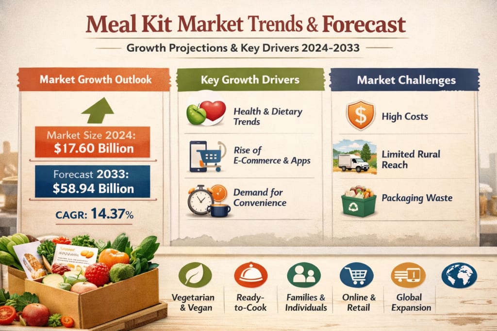 The global Meal Kit Market is entering a powerful growth phase, driven by changing consumer lifestyles, rising health awareness, and the rapid expansion of e-commerce and smartphone usage. According to Renub Research, the Meal Kit Market is expected to reach US$ 58.94 billion by 2033, up from US$ 17.60 billion in 2024, growing at a strong CAGR of 14.37% from 2025 to 2033.