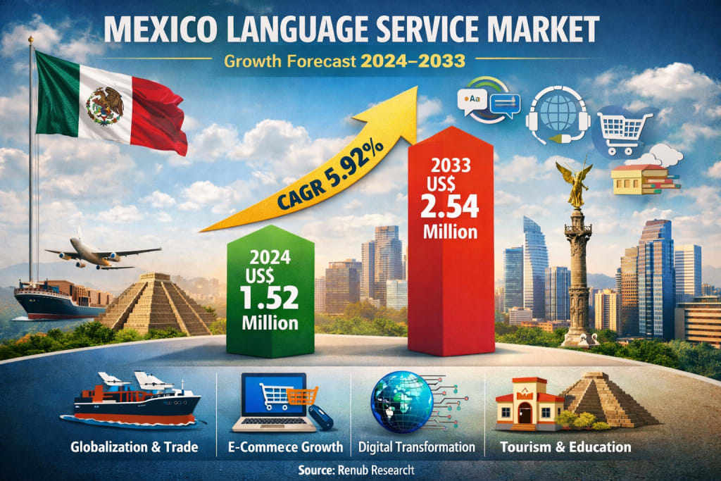 The Mexico Language Service Market is steadily emerging as a critical support industry in the country’s broader economic and digital transformation journey. According to industry estimates, the market is expected to reach US$ 2.54 million by 2033, up from US$ 1.52 million in 2024, registering a compound annual growth rate (CAGR) of 5.92% from 2025 to 2033. This growth reflects Mexico’s deepening integration with the global economy, expanding cross-border trade, rising demand for multilingual digital content, and the increasing importance of localization across industries.