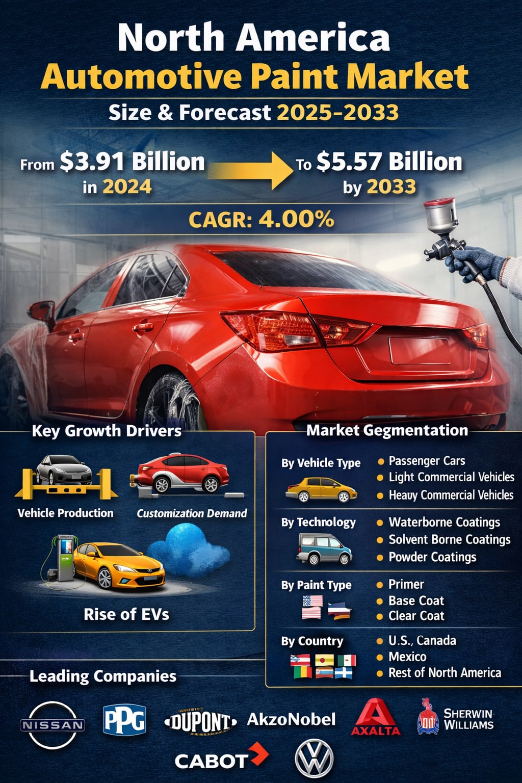 According to Renub Research, the North America Automotive Paint Market was valued at US$ 3.91 billion in 2024 and is expected to reach US$ 5.57 billion by 2033, expanding at a CAGR of 4.00% from 2025 to 2033. This steady growth reflects a region in transition—where rising vehicle production, the boom in electric vehicles (EVs), increasing consumer demand for customization, and stricter environmental regulations are collectively reshaping how automotive coatings are developed, produced, and applied.