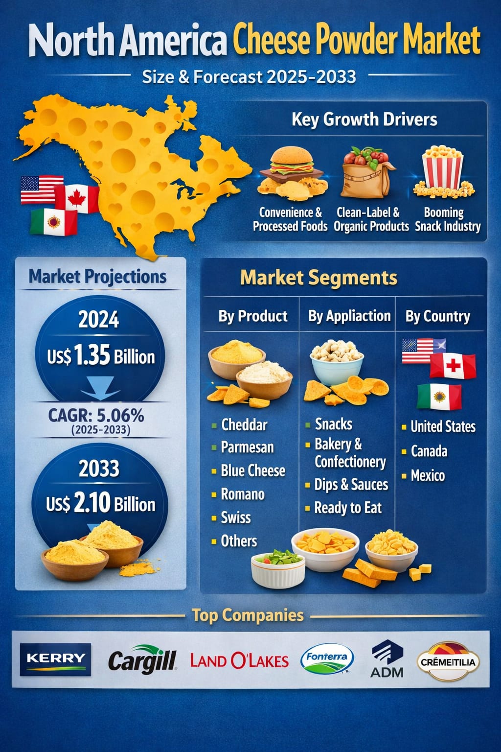 The North America Cheese Powder Market is entering a phase of strong and steady expansion, supported by evolving consumer lifestyles, a booming snack culture, and continuous innovation in processed food formulations. According to Renub Research, the market was valued at US$ 1.35 billion in 2024 and is projected to reach US$ 2.10 billion by 2033, growing at a compound annual growth rate (CAGR) of 5.06% from 2025 to 2033.
