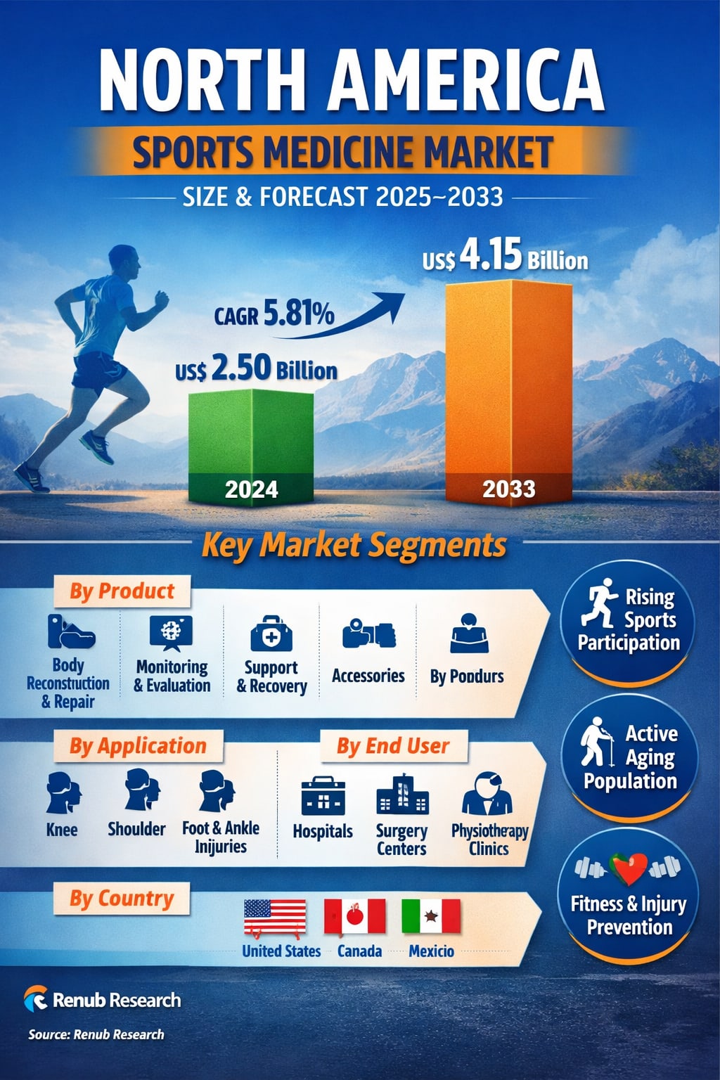 According to Renub Research, the North America Sports Medicine Market is expected to reach US$ 4.15 billion by 2033, up from US$ 2.50 billion in 2024, growing at a CAGR of 5.81% from 2025 to 2033. This steady expansion reflects more than just rising injury rates—it signals a deeper shift in how people approach fitness, aging, and long-term physical performance.