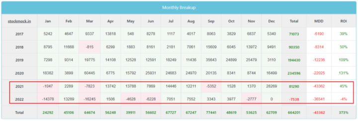 We are in the red in 2022. The market has substantially changed after 2020, which is the cause. It frequently moved in the V, N, and W shapes in 2022. These swings lower the win rate and the average profit, as we observed above.