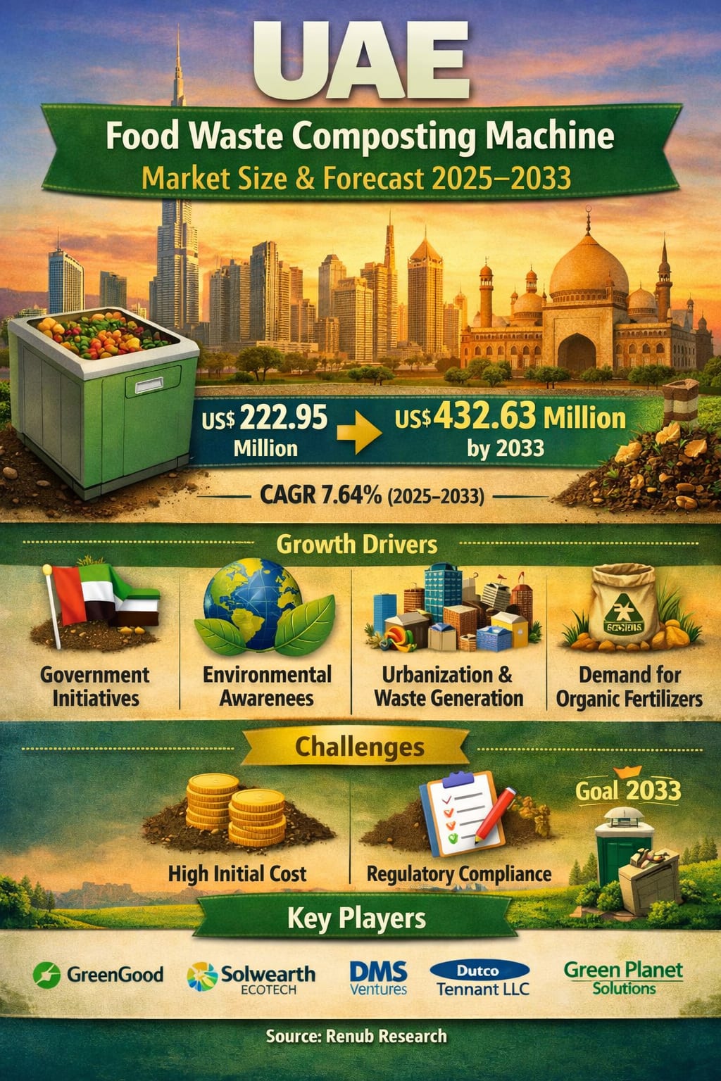 According to Renub Research’s latest industry assessment, the UAE Food Waste Composting Machine Market is expected to grow from US$ 222.95 million in 2024 to US$ 432.63 million by 2033, registering a compound annual growth rate (CAGR) of 7.64% from 2025 to 2033. This steady expansion reflects the country’s rising commitment to sustainable waste management, environmental protection, and circular economy principles.