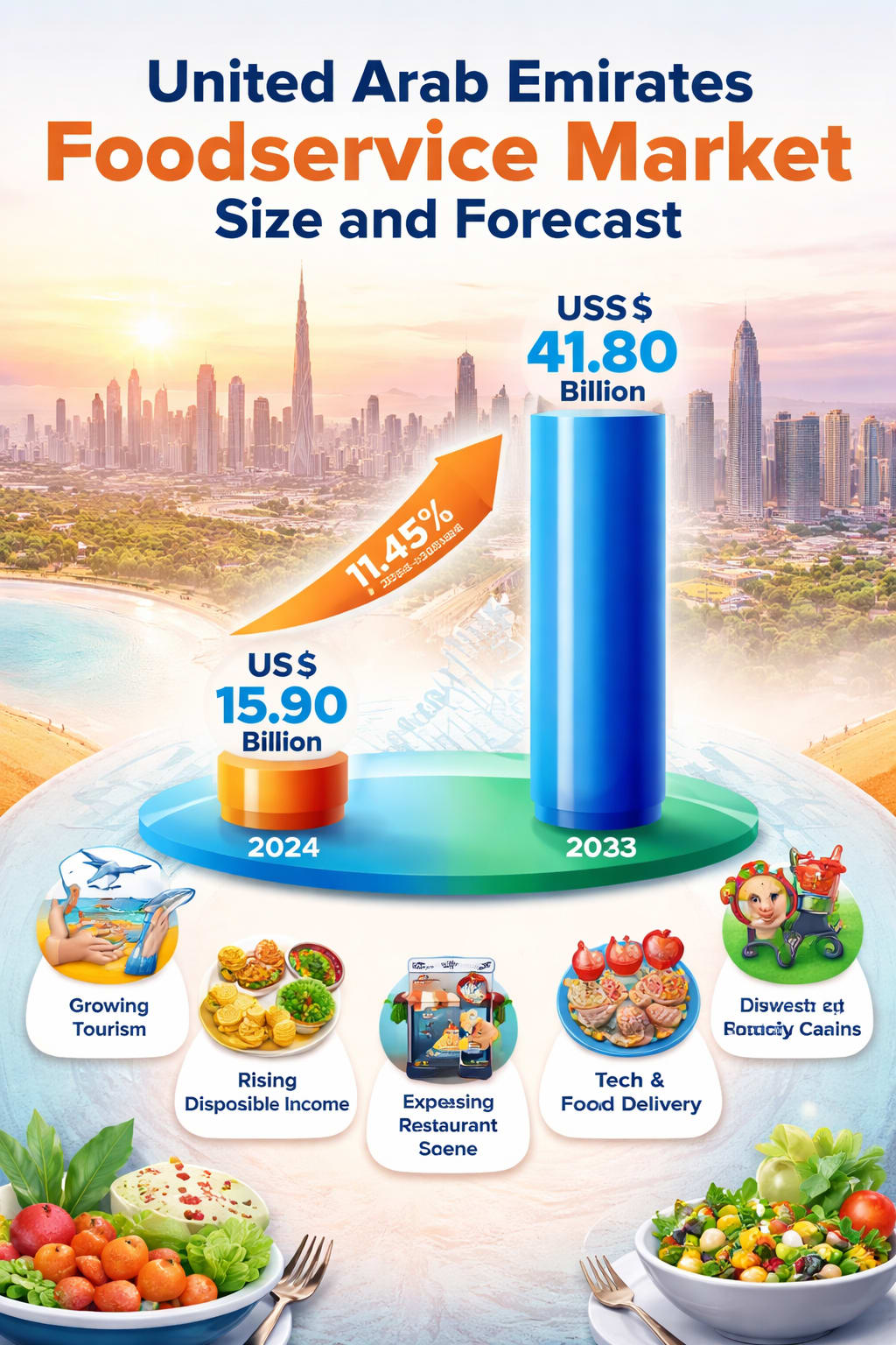 The UAE foodservice market is entering a golden decade of expansion. With Renub Research projecting growth from US$ 15.90 billion in 2024 to US$ 41.80 billion by 2033 at a CAGR of 11.45%, the industry is clearly positioned as one of the most dynamic sectors in the country’s economy.