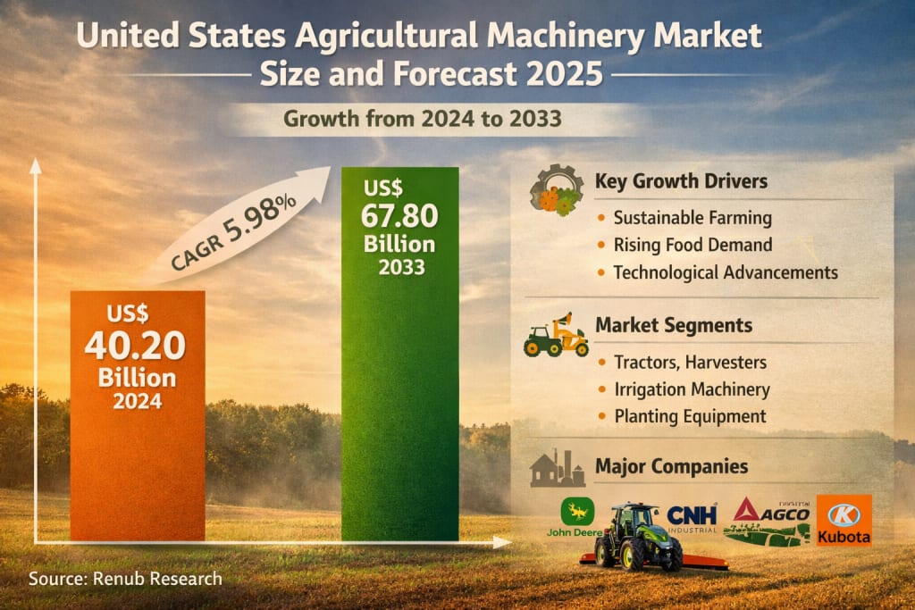 The United States has long been a global leader in agricultural innovation, and in 2025, that leadership is being reinforced by rapid growth in the agricultural machinery market. According to Renub Research, the United States Agricultural Machinery Market is expected to reach US$ 67.80 billion by 2033, up from US$ 40.20 billion in 2024, registering a compound annual growth rate (CAGR) of 5.98% from 2025 to 2033.