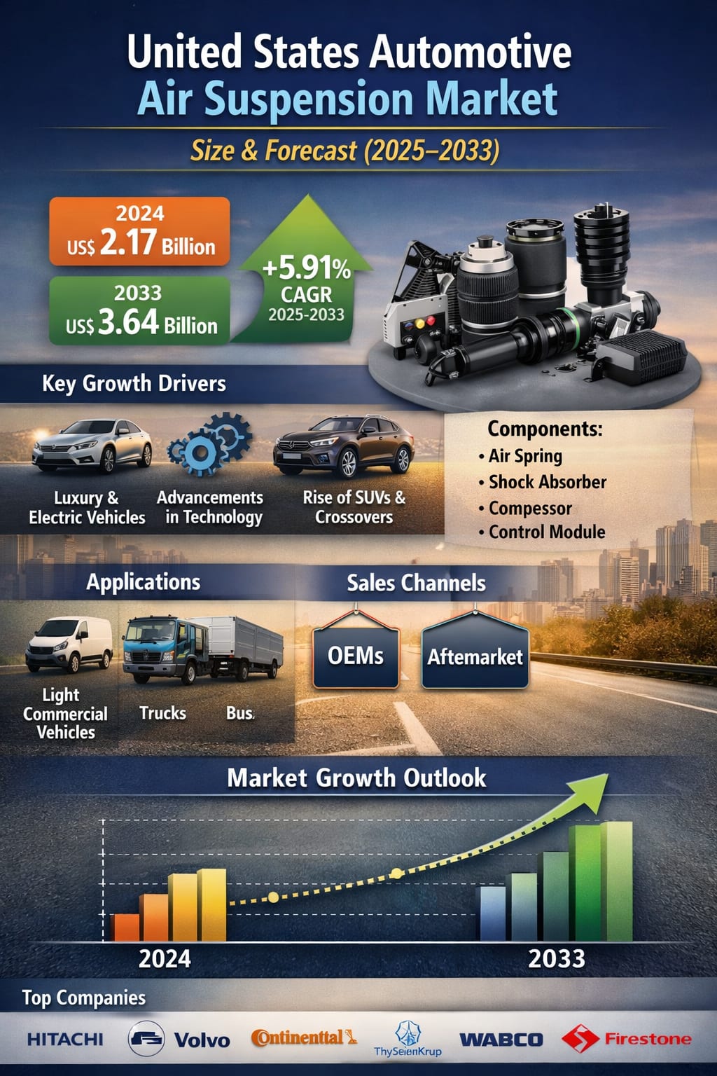 The U.S. automotive air suspension market’s growth trajectory reflects not only rising vehicle sales in certain segments but also a structural shift in how vehicles are engineered and positioned in the market. From US$ 2.17 billion in 2024 to a projected US$ 3.64 billion by 2033, the industry’s expansion at a 5.91% CAGR signals healthy and sustainable demand.