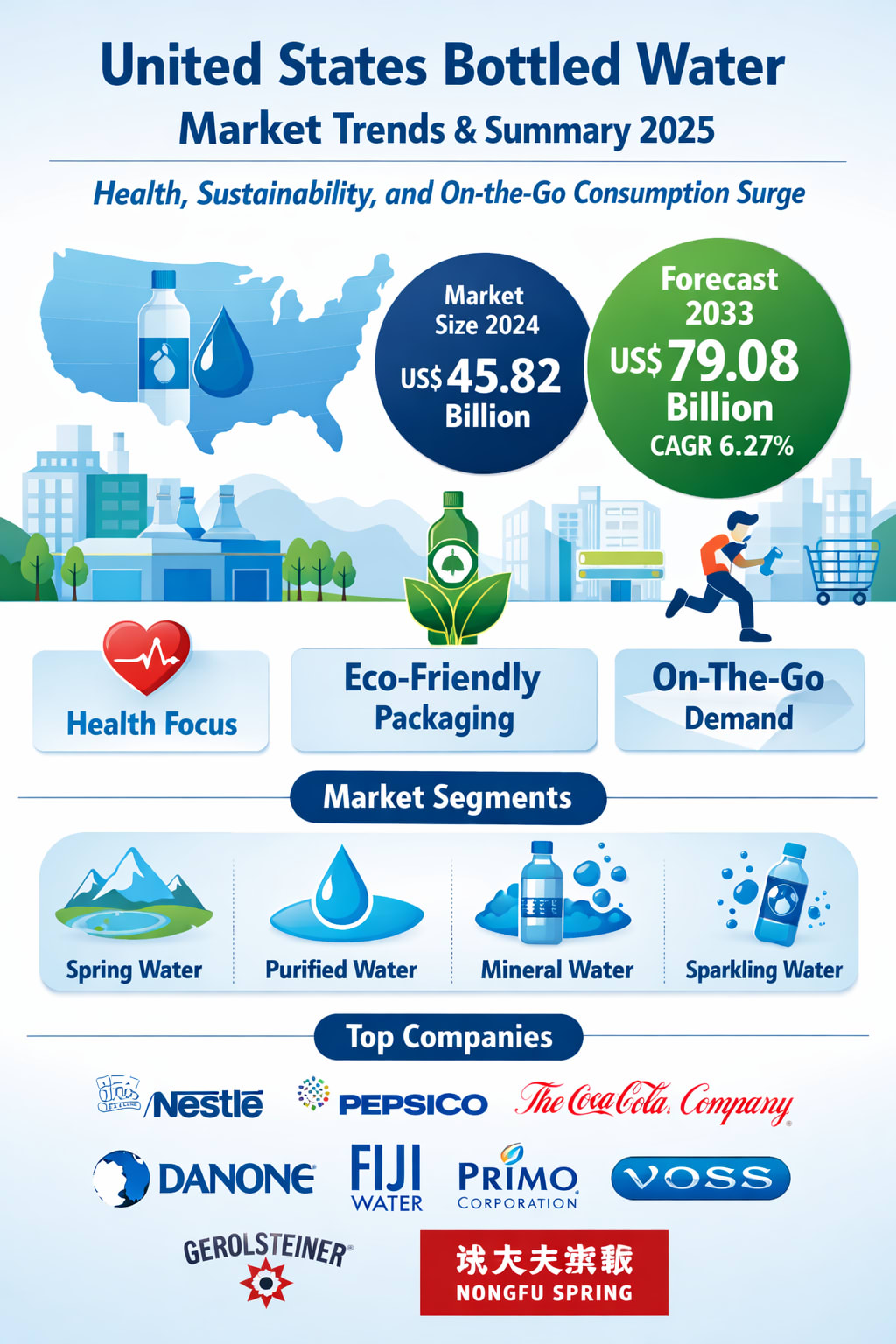The United States bottled water market is no longer just about quenching thirst—it is about health, convenience, trust, and environmental responsibility. With the market expected to grow from US$ 45.82 billion in 2024 to US$ 79.08 billion by 2033, the industry stands at the intersection of wellness trends and sustainability imperatives.