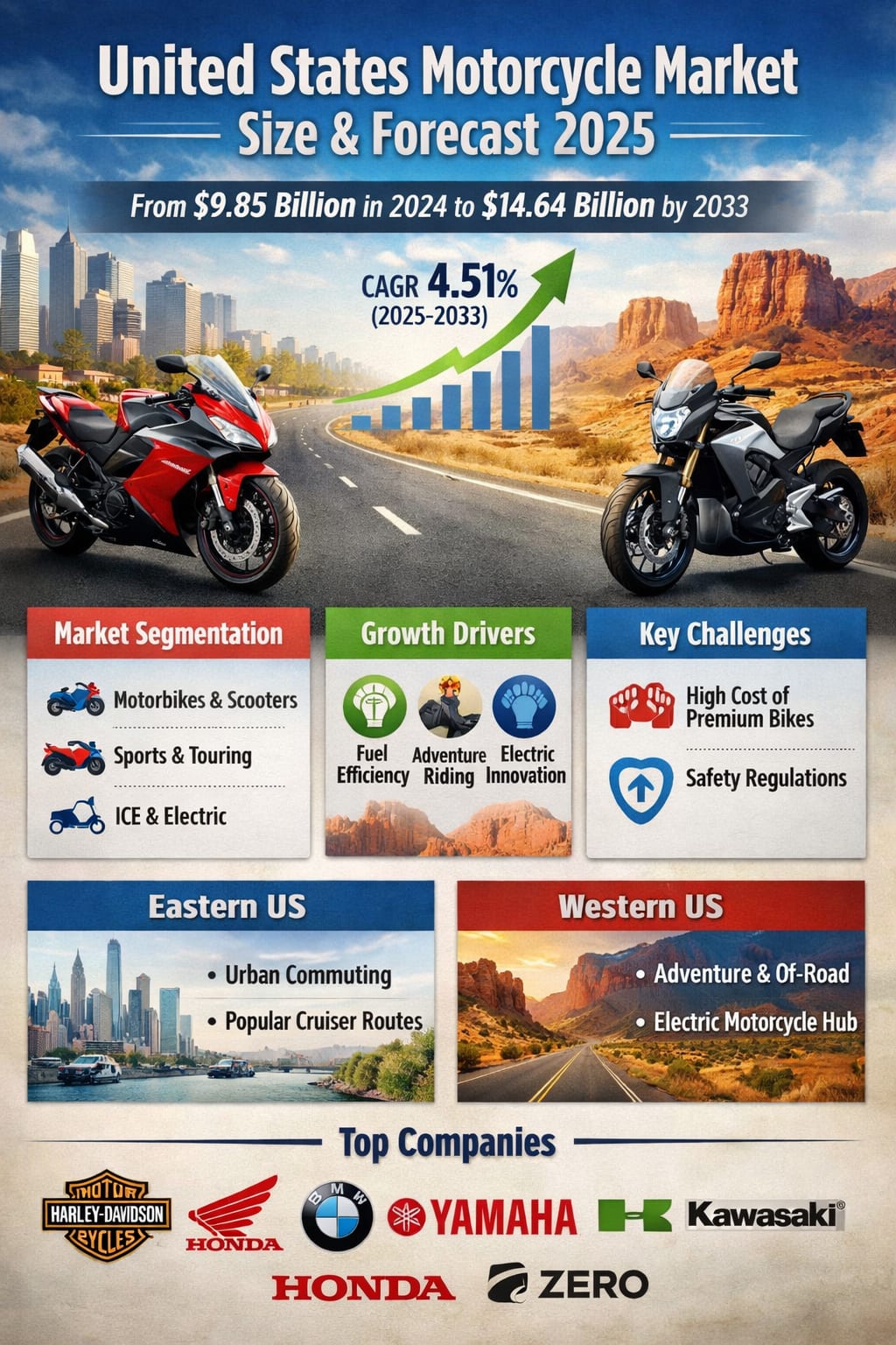 The United States motorcycle market continues to hold a unique position within the broader automotive and mobility landscape, blending lifestyle, performance, and practical transportation into one dynamic industry. In 2024, the U.S. motorcycle market stood at US$ 9.85 billion and is projected to expand to US$ 14.64 billion by 2033, growing at a compound annual growth rate (CAGR) of 4.51% from 2025 to 2033. This steady growth reflects a combination of shifting consumer preferences, technological innovation, and the rising appeal of motorcycles as both recreational machines and efficient mobility solutions.