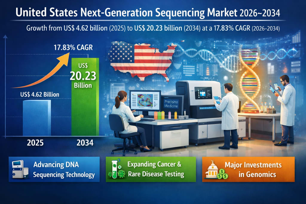 The United States Next-Generation Sequencing (NGS) Market is projected to witness robust growth over the forecast period, driven by strong adoption across healthcare, biotechnology, and pharmaceutical research. According to Renub Research, the market is expected to expand from US$ 4.62 billion in 2025 to US$ 20.23 billion by 2034, registering a compound annual growth rate (CAGR) of 17.83% from 2026 to 2034.