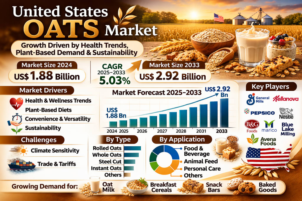 The United States oats market is steadily carving out a stronger position within the country’s broader food and agriculture landscape. According to Renub Research, the United States Oats Market is expected to reach US$ 2.92 billion by 2033, growing from US$ 1.88 billion in 2024, at a compound annual growth rate (CAGR) of 5.03% from 2025 to 2033. This growth reflects a deeper shift in American eating habits—one driven by health consciousness, the rise of plant-based diets, and a growing preference for convenient yet nutritious food options.