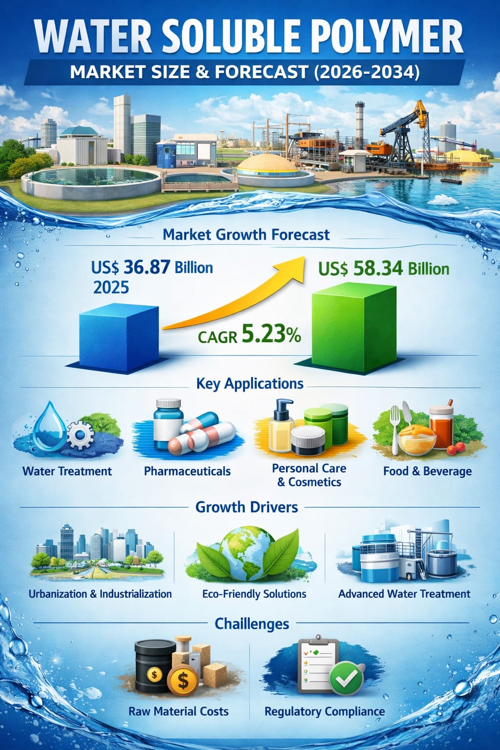 The global water-soluble polymer industry is entering a decisive growth phase, driven by the world’s rising demand for clean water, efficient industrial processes, and sustainable materials. According to industry estimates, the market is set to expand from US$ 36.87 billion in 2025 to US$ 58.34 billion by 2034, registering a compound annual growth rate (CAGR) of 5.23% between 2026 and 2034.