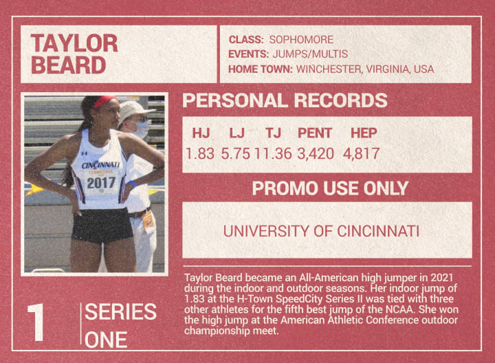 Taylor Beard is a competitor that we first saw compete during the 2020 season which was her freshman year at Cincinnati. Some of you may roll your eyes at this but when we saw her at an indoor meet in Kentucky, she finished ninth in the high jump, 18th in the long jump and 31st in the 60-meter hurdles, yet we had this feeling that we were watching a special athlete. We can't totally explain the feeling but the feeling is rarely wrong and in 2021 she proved our hunch correct by becoming an All-American high jumper and being able to compete in the Olympic trials.