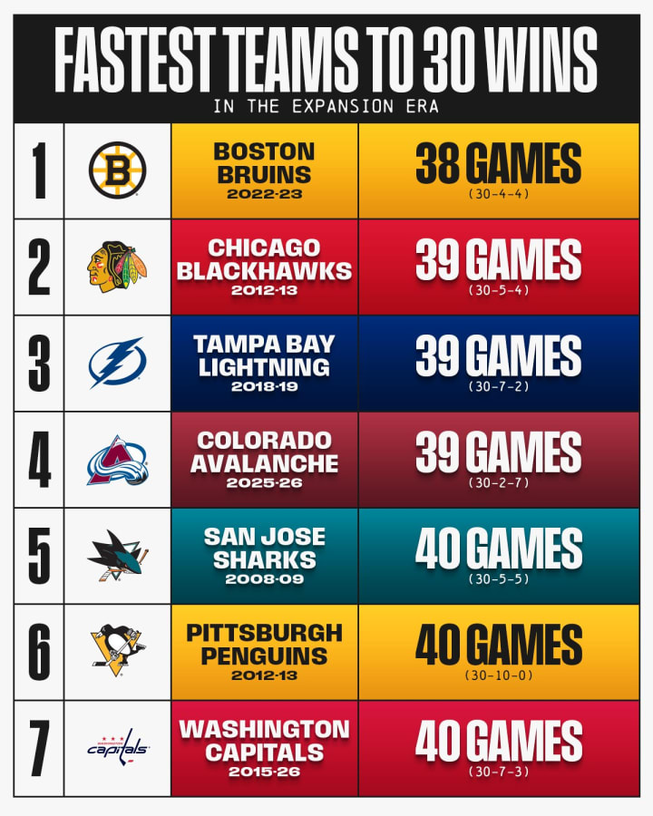 30 wins. The Avalanche won 30 games before 2026 was rung in. We reached 30 wins in our 39th game. That matches two other franchises for the second-fastest to 30 wins, with only the Bruins from three years ago getting there faster (38 games). We've won nine straight games again! We still have only two losses in regulation. We are at least 10 points ahead of everybody else in the league. We are on pace to win 64 games this season, which obliterates our franchise record and is one short of the NHL record.