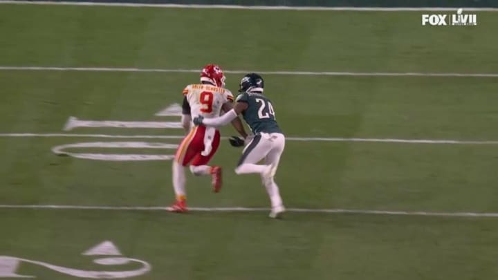 On third down, James Bradberry was called for holding on Juju Smith-Schuster, and from the looks of this, it was quite ticky-tack. There was just enough, but I've seen bigger and longer holds get ignored. It's funny. As a hockey fan, I have to mention this. Games deep in the Stanley Cup Playoffs are known for nothing getting called at certain times (usually the wrong time). The NFL is the opposite: they're known for things getting called at the wrong time, and they're usually things that could have been let go. As we all know, defensive holding is five yards and an automatic first down, and with a minute and a half left, the ball was tossed to Jerick McKinnon, who ran all the way to the two yard line and stopped, allowing the Chiefs to take a pair of knees and kill the clock. With 11 seconds left, Harrison Butker nailed a 27-yard field goal, and the Eagles couldn't do anything in the very little time they had left.