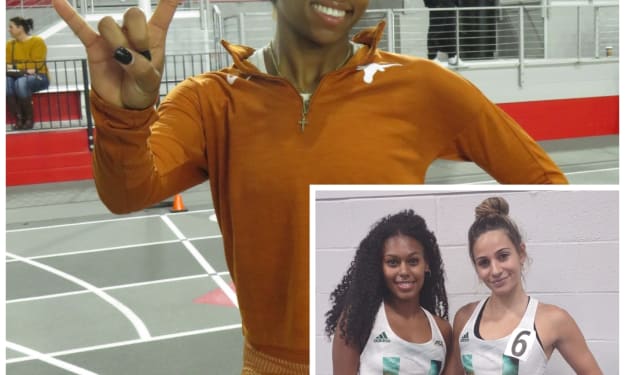 Photo: Kennedy Simon of Texas, Sanaa Hebron & Moriah Oliveira of Miami. On Jan. 14, the Texas foursome of Rachel Helbling, Rahsidat Adeleke, Julien Alfred and Kennedy Simon won the 1,600-meter relay on the second and final day of the Cardinal Classic, in Louisville, Kentucky.