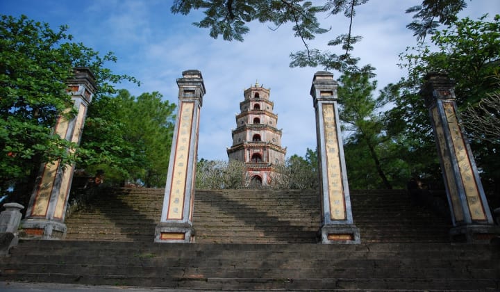 - Thien Mu Pagoda: Also on the north shore of the Perfume River about 3km from the Imperial Citadel. You can get there by dragon boat along the Perfume River, or for those feeling more energetic, a pleasant bicycle ride. The Thien Mu Pagoda is regarded as the unofficial symbol of the former imperial capital. Today it is the home of the Austin Motor Vehicle which drove Thich Quang Duc to his self-immolation in Saigon in 1963 in protest against the Diem regime. It is still home to many monks and a holy site visited by many everyday.