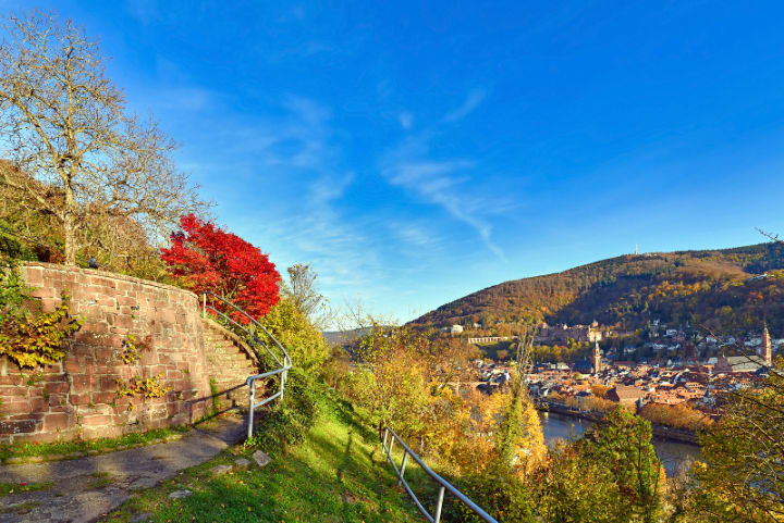 Along the Philosophers' Way, you can take in great views through the forest to different monuments, towers, ruins, a beer garden, and the Thingsstatte, a Nazi-era amphitheater. The walkway is on the north side of the Neckar and stretches along the side of Heilignberg or Saints' Mountain. There are beautiful views at sunset.