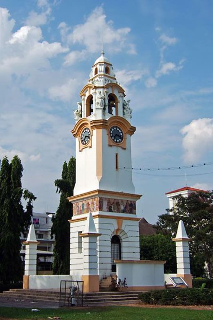 Built in 1909, the Birch Memorial Clock Tower has a 6ft. 6 in. bell. It honors the memory of James W.W. Birch, who was Perak’s first British resident. He was murdered in 1875 at Pasir Salak by local Malay chiefs. The friezes on the clock tower illustrate the growth of civilization and feature figures like Moses, Buddha, Shakespeare, and Charles Darwin. The road upon which the clock tower stands was renamed for one of Birch’s killers, who today are considered to be nationalists while Birch is remembered for his disregard of local custom.