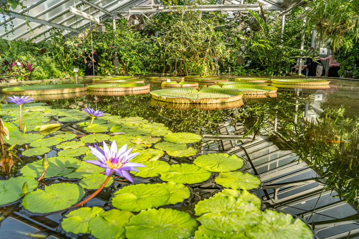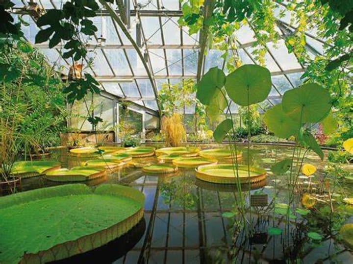 The Gruson-Gewachshauser is a collection of greenhouses that are home to a traditional botanical garden featuring an exotic collection of plants kept by the industrialist Herrmann Gruson. There are over 3000 exotic plant species and varieties cultivated in the nine public greenhouses. Each of the greenhouses is dedicated to a certain family of plants or a tropical or subtropical region. These greenhouses are also home to animals like piranhas, Malawi cichlids, poison dart frogs, and turtles.