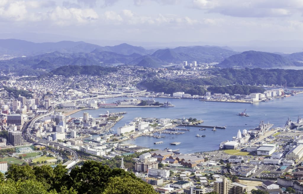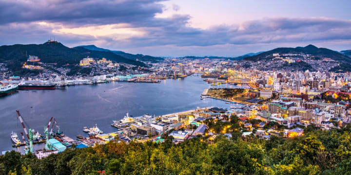 Nagasaki sits on the northwest coast of the island of Kyushu. The city is set on a large natural harbor with buildings on the terraces of the surrounding hills. This city is remembered for a key moment that happened during WW II, when it suffered an Allied nuclear attack in August 1945.