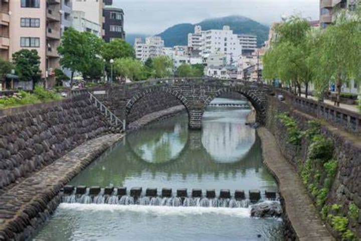 The Megane-bashi is the best-known of several bridges that span the river. The river Nakashima-gawa is crossed by a picturesque collection of 10 17th-century stone bridges. At one time each bridge was the distinct entranceway to a separate temple. The Megane-bashi or spectacles bridge was given its name because the water and the arches come together to form a reflection in the water thus creating a spectacular effect.