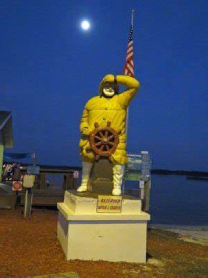 In Oak Hill, Florida you’ll find the Uncomfortable Fisherman. This is the statue of Captain J. Goodrich depicted sitting upon his ship’s wheel.