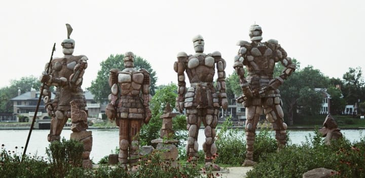 In Rockford, Illinois people are amazed when seeing the Rockmen Guardians. These are 12-foot-tall statues that have been made out of boulders and cement by artist Terese Agnew. Each statue has its one unique pose and the leader of them all wields a stone sword. They are located near the Rock River Recreation Path.