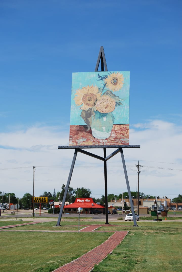 Art lovers will discover that Goodland, Kansas has a 32-foot-tall replica of the painting Sunflowers by Vincent Van Gogh. The painting sits on an 80-foot-tall easel easily seen from the highway. It pays homage to the state of Kansas being known as The Sunflower State. All around Goodland, you can see many sunflower fields.