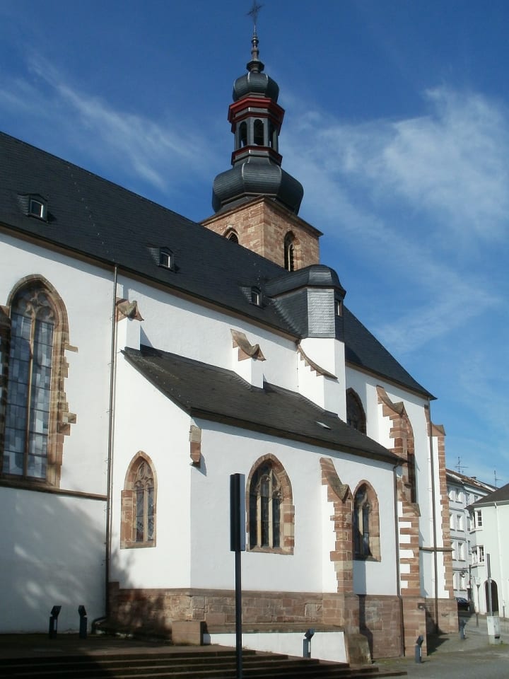 The steeple of the late Gothic Schlosskirche or Castle Church dating from the 15th century was given a Baroque crest by Stengel in 1743. The church was destroyed in WW II and restored in the 1950s. George Meistermann designed the lovely stained-glass windows. In the choir, you can find the sarcophagi of the last princes of Saarbrucken. Presently the church is a museum looked after by the Foundation for the Cultural Heritage of the Saarland.