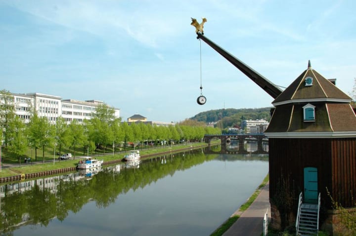 It flanks the Wilhelm-Heinrich-Brucke Bridge bearing witness to Saarbrucken’s flourishing trade history. The crane was first constructed by the Krahnen-Gesellschaft according to plans drawn up by Stengel. After being destroyed on several occasions the final construction was done in 1991 and financed by donations.